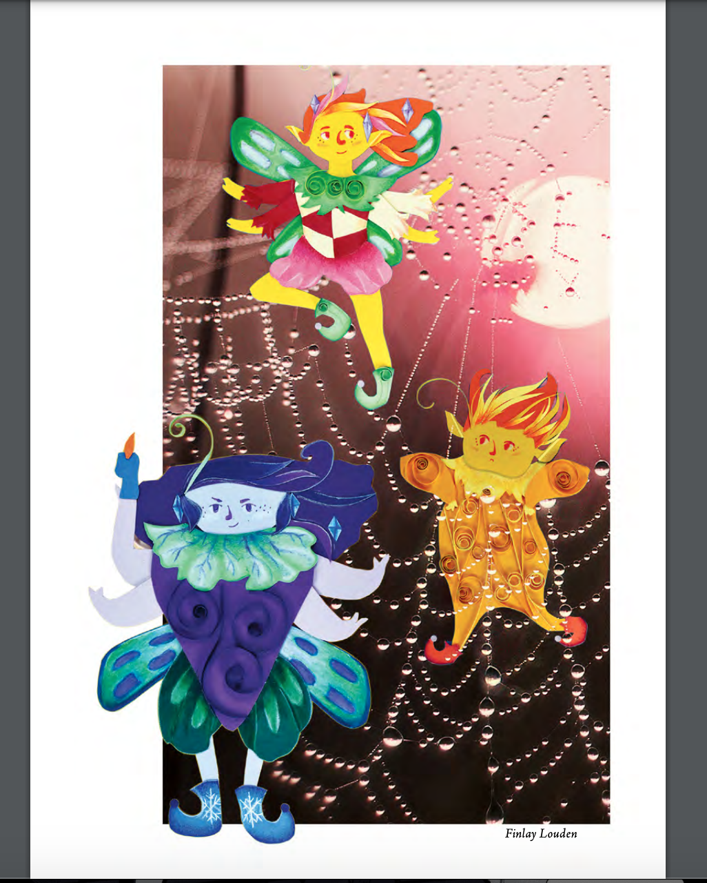 The fairies seen here are the Spring Fairy, the Autumn Fairy, and the Winter Fairy. They are made of cardstock with quiling and details in colored pencil. Each one is about 5” tall.